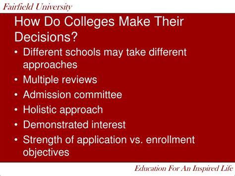 During the decision-making process, admissions officers carefully review each application and assess the fit between the applicant and the college. They consider how the applicant's interests, goals, and achievements align with the college's mission and values. Admissions committees often consist of a group of individuals who collectively review and discuss applications to ensure a fair and holistic evaluation.